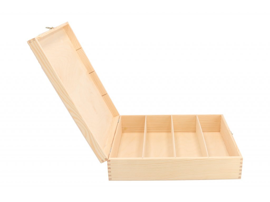 Krabička je rozdělená na čtyři přihrádky, stěny lze však jednoduše z krabičky vyjmout.